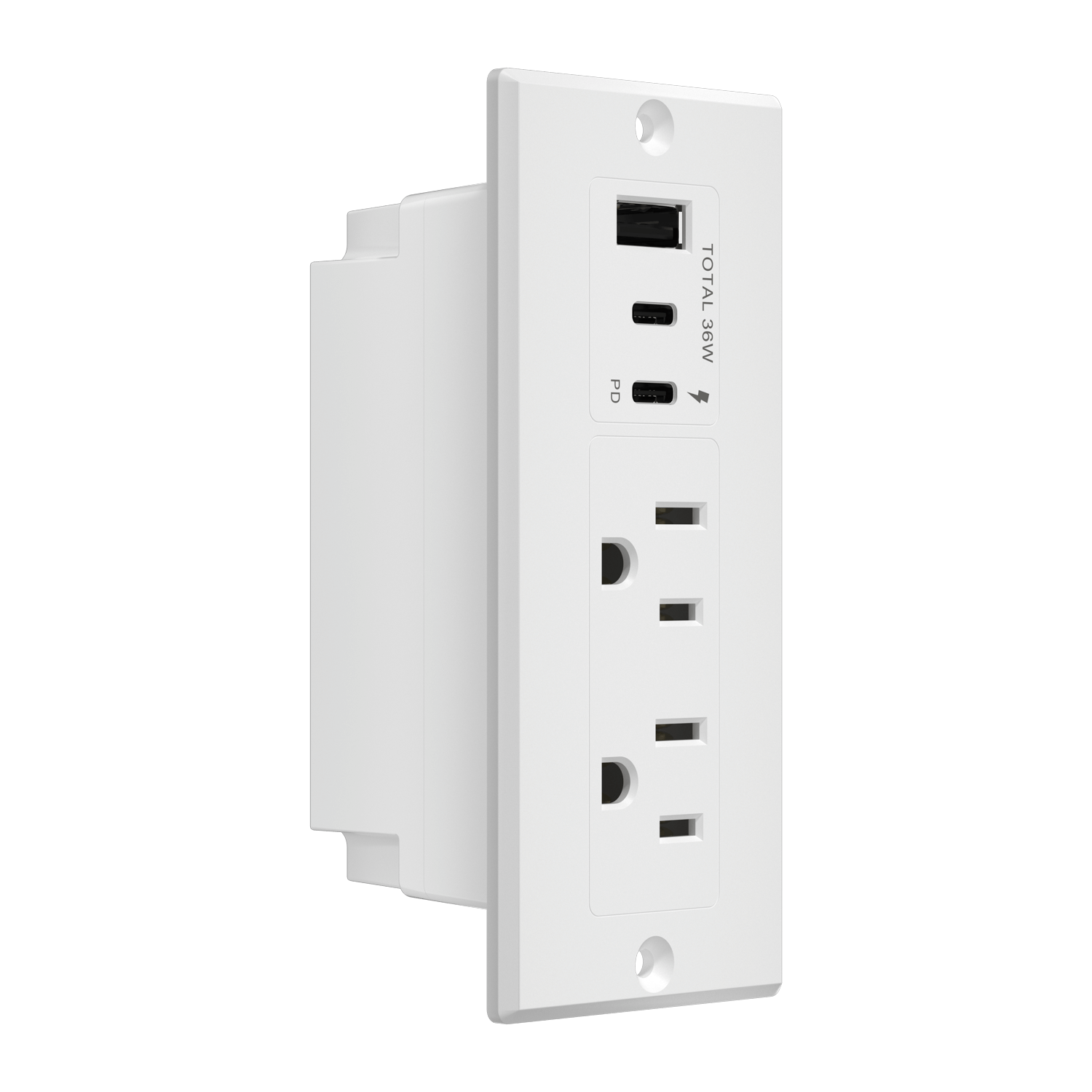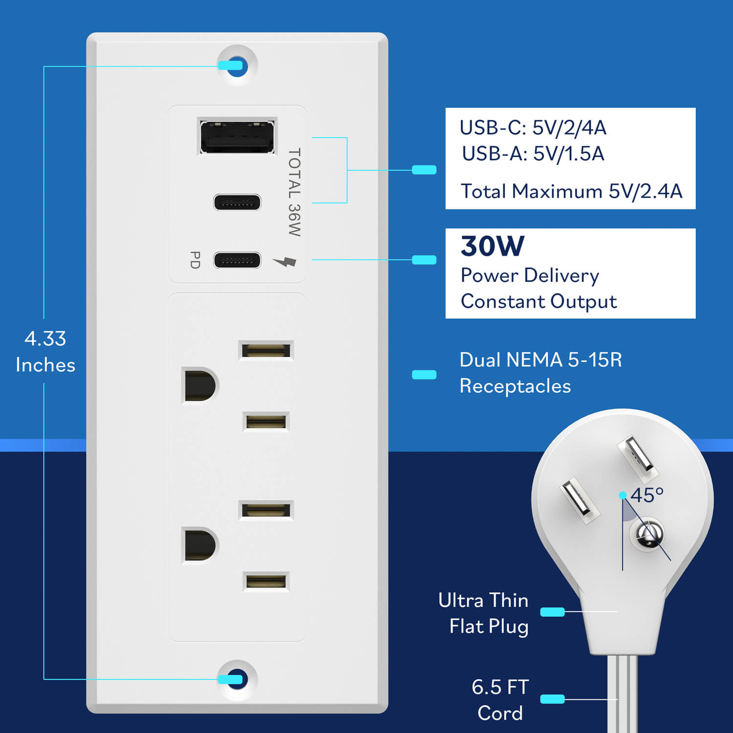 Equipped with 2 tamper-resistant AC outlets, 2 USB Type-C ports with, and 1 USB Type-A port, this grommet offers fast (PD36) and efficient charging for multiple devices simultaneously. Its 6.5 ft extension cord ensures easy access to power sources, while the 45-degree angled flat plug keeps the bottom outlet free. The innovative auto-slide dust cover protects USB ports from dust and debris, maintaining device longevity and cleanliness.