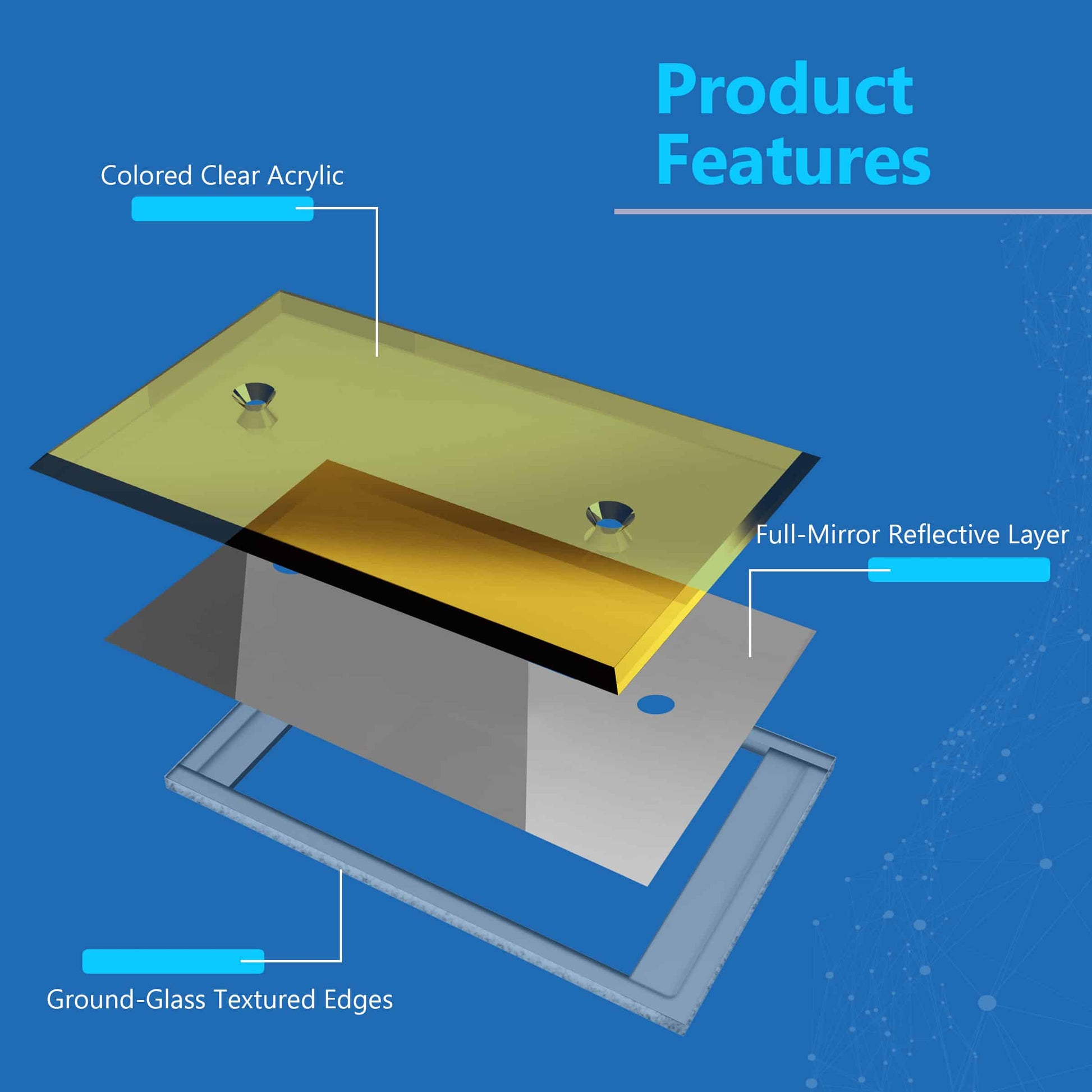 Crafted with a genuine glass mirror layer sandwiched between two durable acrylic plexiglass layers, this three-dimensional mirrored design provides a premium look and lasting durability. The oversized 5.50” x 3.50” dimensions ensure greater wall coverage, making it ideal for concealing wall imperfections from previous installations while delivering a flawless finish.