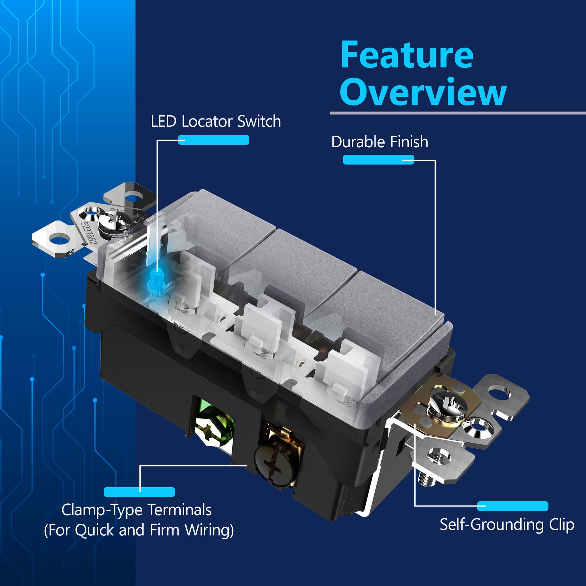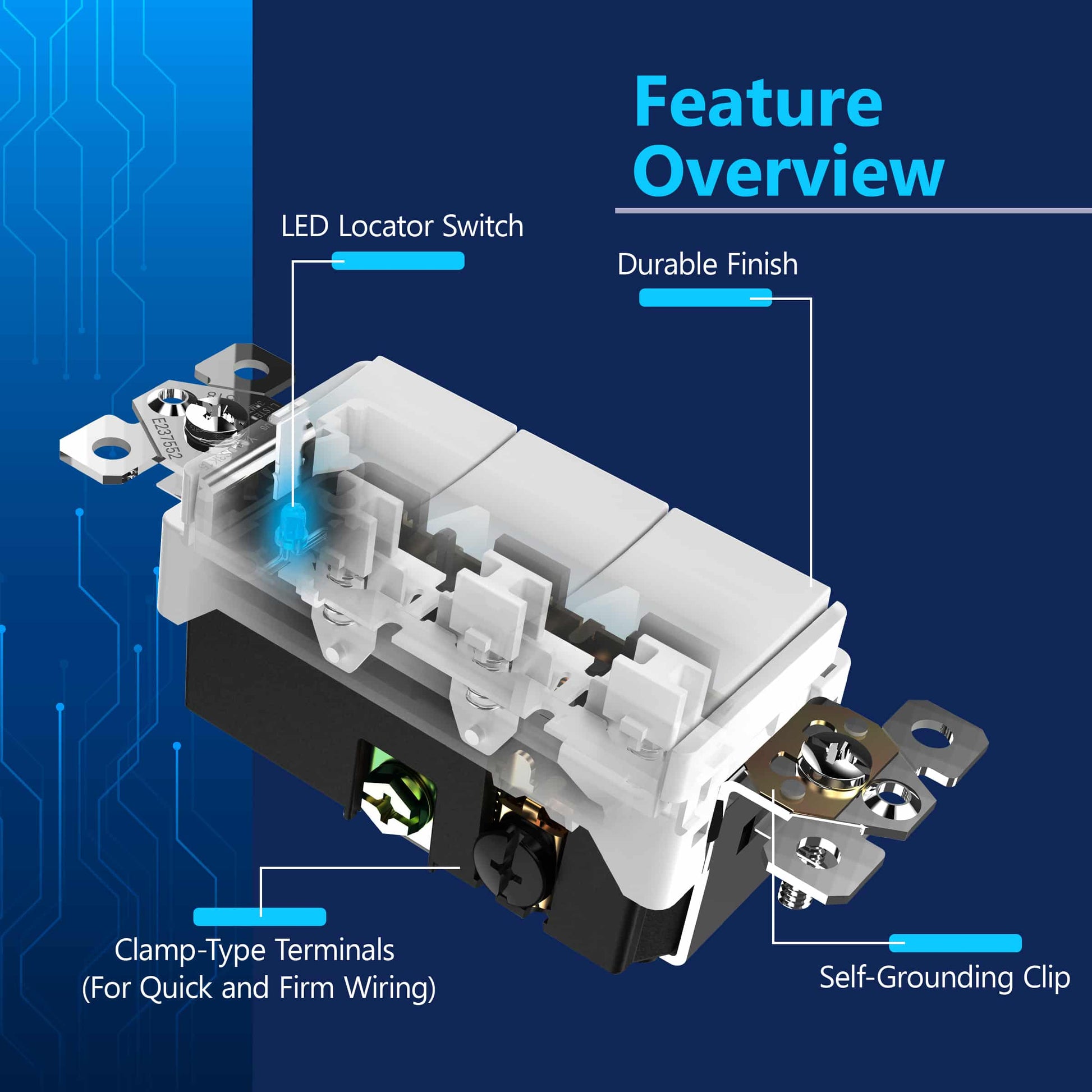 Ideal for restrooms, tool sheds, walk-in closets, and other compact spaces, this combination switch is designed for easy installation with break-off plaster ears, back wire clamps, and self-grounding clips, making it a reliable choice for both DIY and professional installations. Its modern design and versatile functionality make it a perfect fit for contemporary interiors.