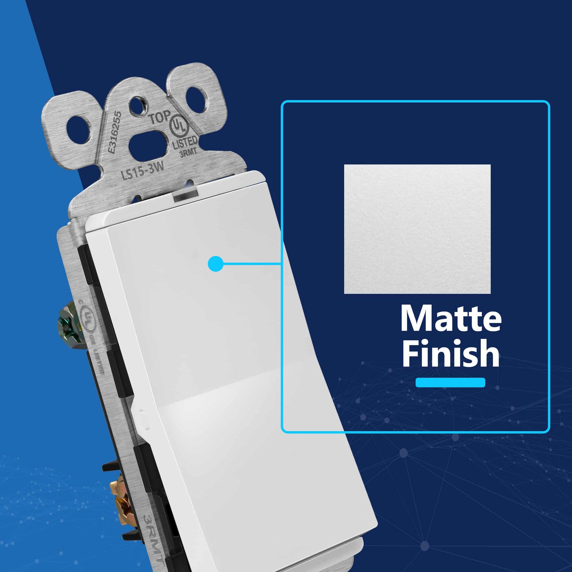 This decorator switch features an integrated LED locator light for easy visibility in dark environments, making it ideal for restrooms, pantries, walk-in closets, and more. The paddle design provides intuitive operation with a smooth, responsive feel, and its 3-way compatibility allows control of a single light fixture from two different locations, adding versatility to any room.