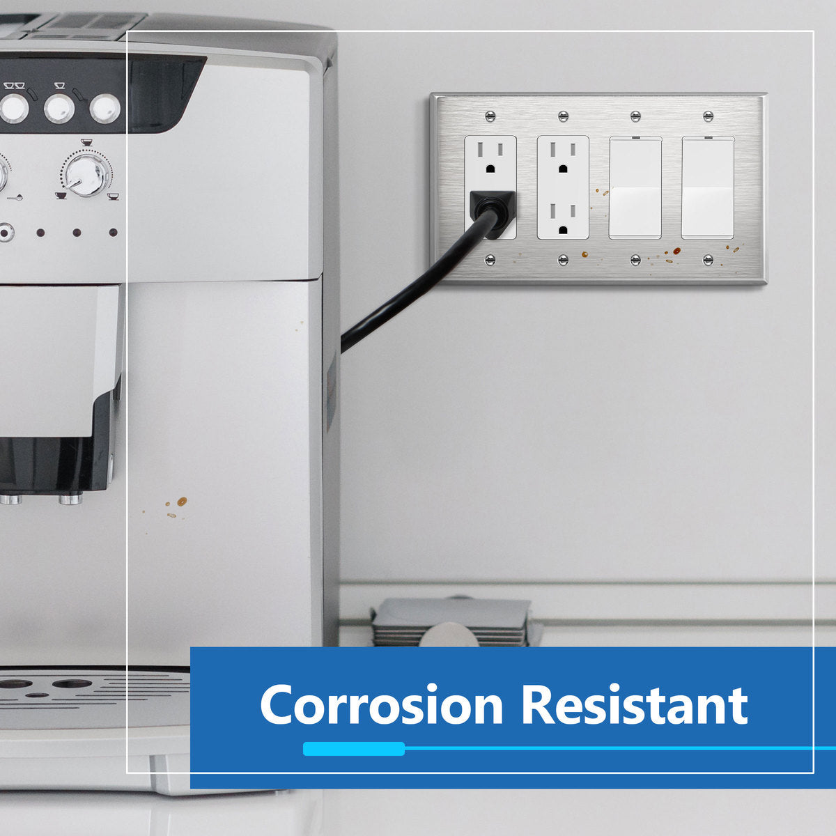 Decorator Switch or Receptacle Metal Wall Plate, Stainless Steel Outlet Cover, Corrosion Resistant, 4-Gang, Mid-Size