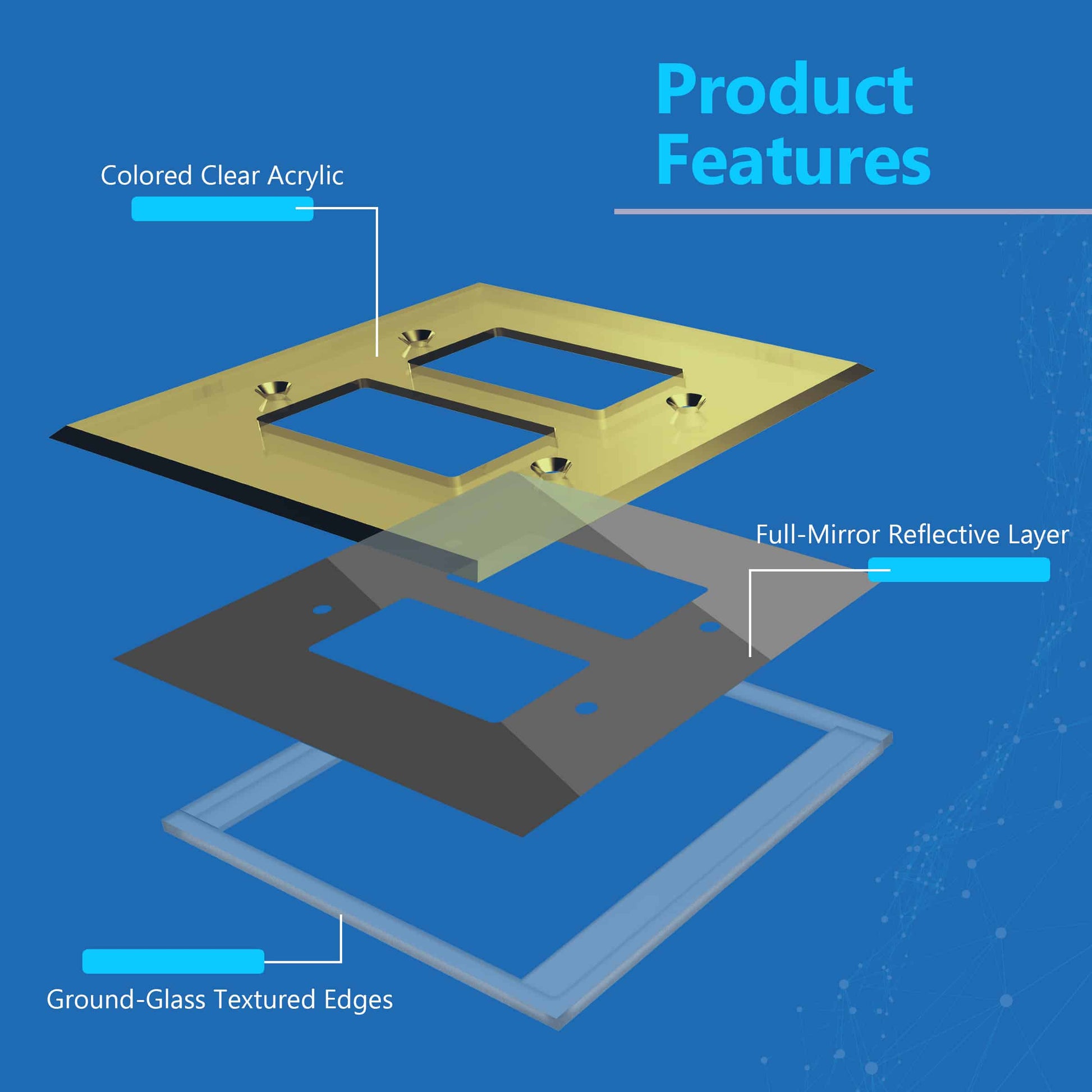 Constructed with genuine glass mirror encased between two durable acrylic plexiglass layers, this three-dimensional mirrored design offers exceptional durability and a premium appearance. The oversized dimensions provide increased wall coverage, making it an ideal choice for concealing imperfections from previous installations while ensuring a flawless, seamless look. The screw-free face adds to its clean, modern appeal, making it a standout feature in any space.