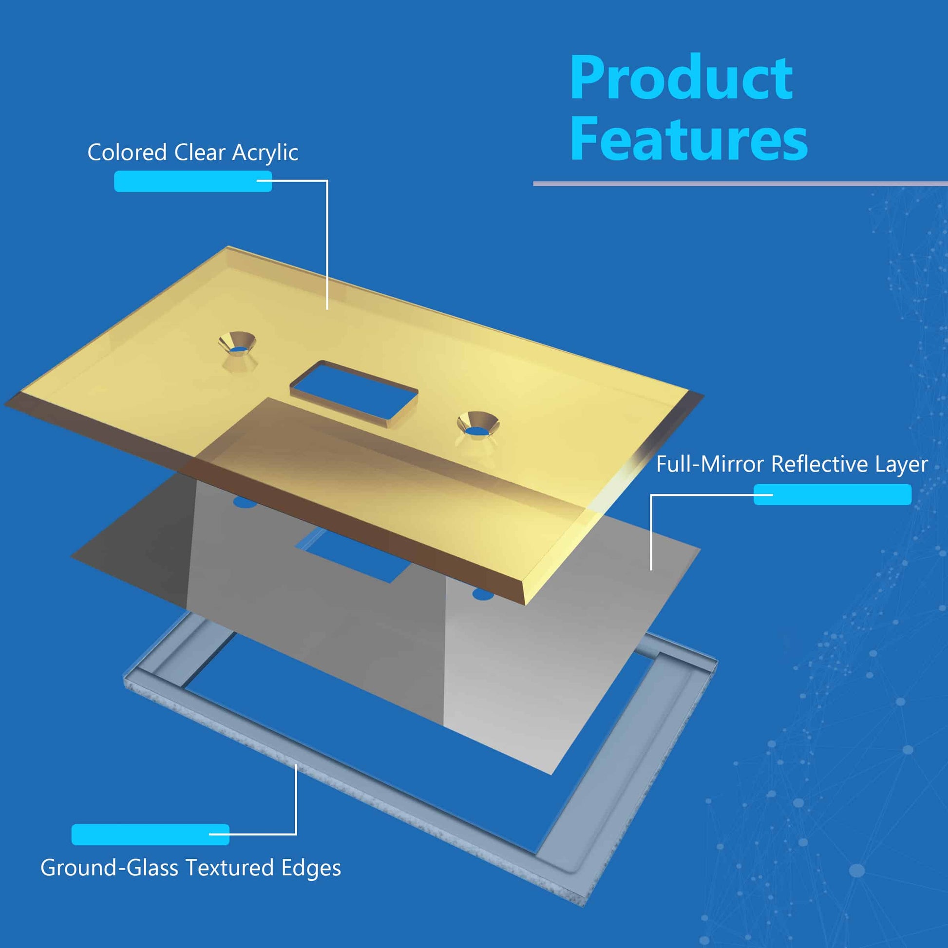Crafted with a genuine glass mirror layer sandwiched between two durable acrylic plexiglass layers, this three-dimensional mirrored design provides a premium look with long-lasting durability. The oversized dimensions ensure greater wall coverage, making it ideal for concealing imperfections from previous installations while maintaining a flawless finish. Designed to fit toggle switches, it offers a seamless blend of elegance and practicality.