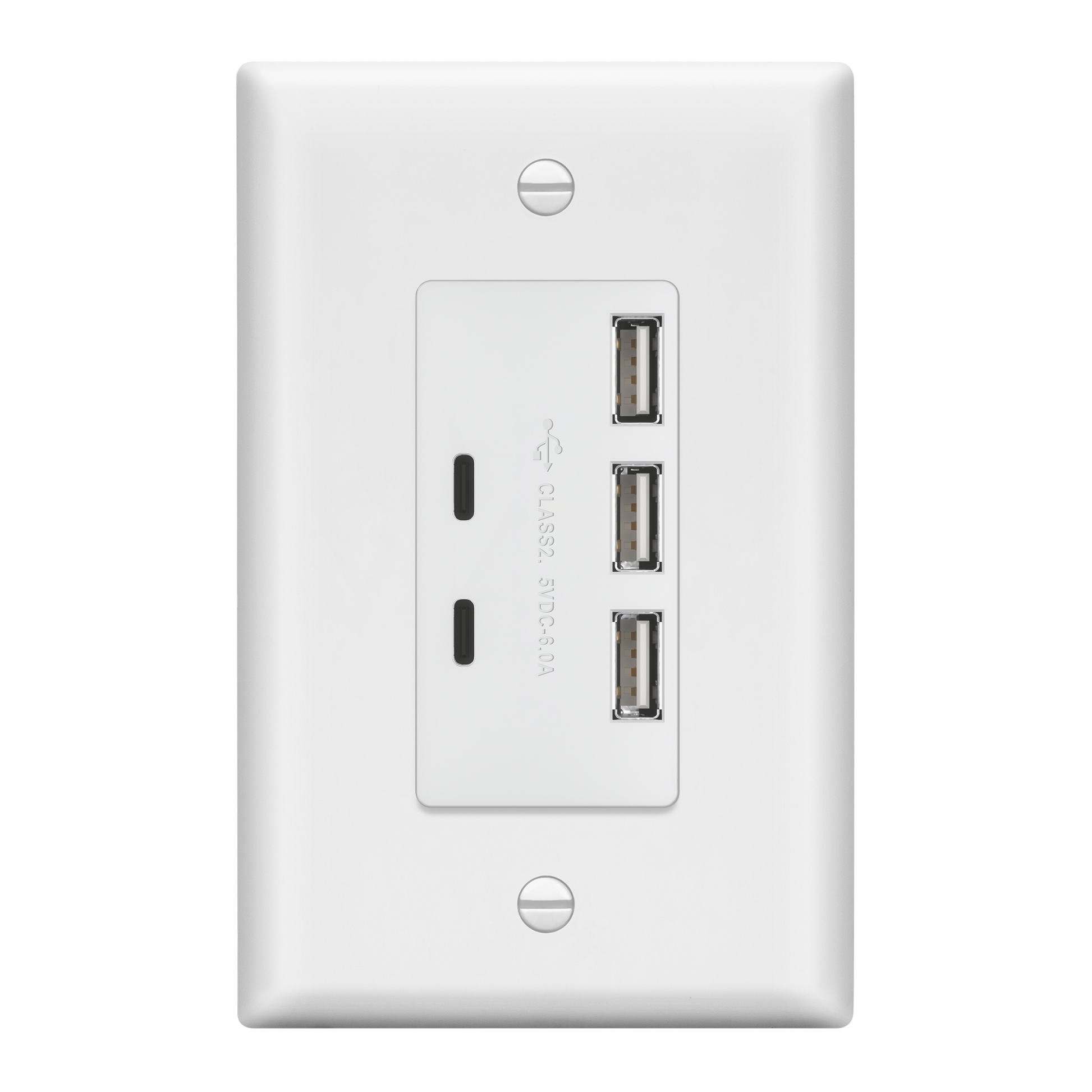 USB Outlet, 6.0A 30W USB A&C in-Wall Charger, 3 USB Type-A and 2 USB Type-C Charging Ports, Interchangeable Face Cover, Wall Plate Included