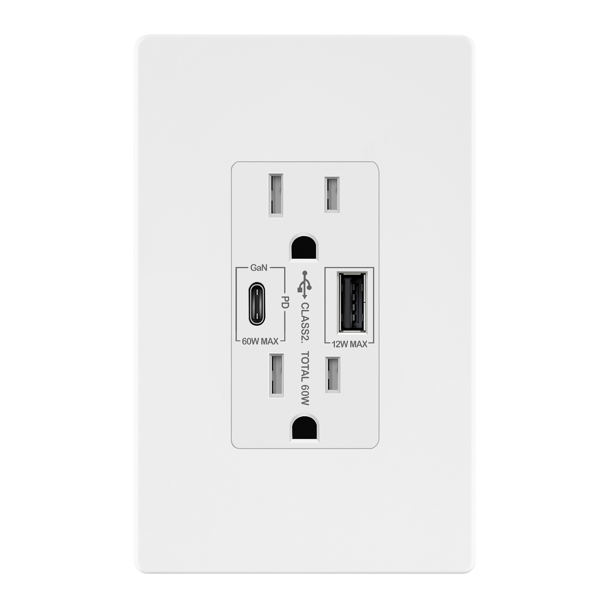 This in-wall USB charger features 1 USB Type-C and 1 USB Type-A port, supporting Power Delivery (PD60) technology for fast, safe, and efficient charging. The USB-C port delivers up to 60W of power, enabling rapid charging for laptops, tablets, smartphones, and other high-demand devices, while the USB-A port provides 5V/2.4A, 1.2A output for universal compatibility. USB compatibility: 1.0, 1.1, 2.0, 3.0, 3.1, including Apple products. A built-in smart chip optimizes charging speeds and ensures device protection. Additionally, the tamper-resistant 15A duplex outlet enhances safety by preventing accidental foreign object insertion.