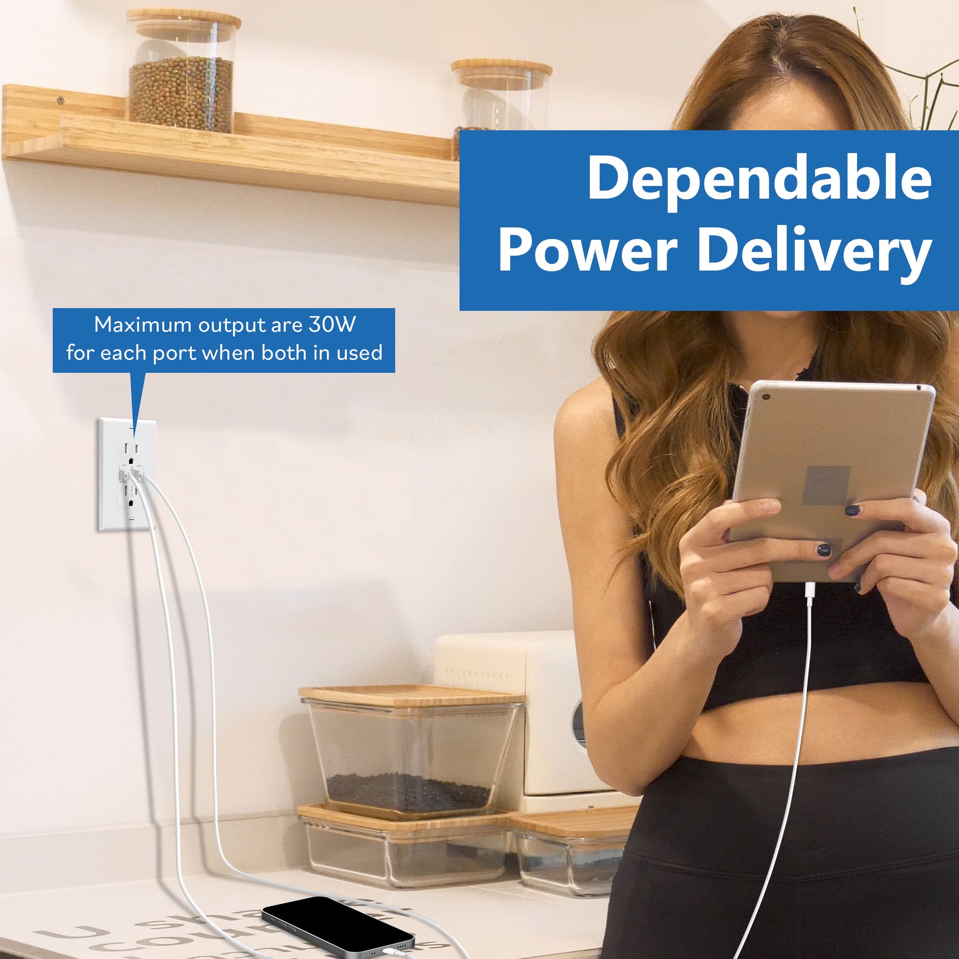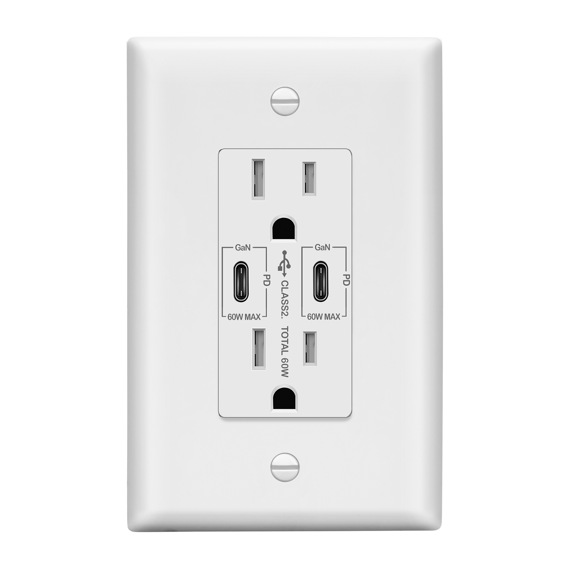 This in-wall USB charger features 2x USB Type-C port, supporting Power Delivery (PD60) technology for fast, safe, and efficient charging. The USB-C port delivers up to 60W of power, enabling rapid charging for laptops, tablets, smartphones, and other high-demand devices. USB compatibility: 1.0, 1.1, 2.0, 3.0, 3.1, including Apple products. A built-in smart chip optimizes charging speeds and ensures device protection. Additionally, the tamper-resistant 15A duplex outlet enhances safety by preventing accidental foreign object insertion.